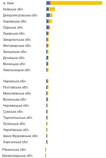 - Київську область — 577,33 млн грн, з них: 397,51 млн грн — кошти Державного бюджету; 154,05 млн грн із місцевого бюджету; 25,77 млн грн з інших джерел.