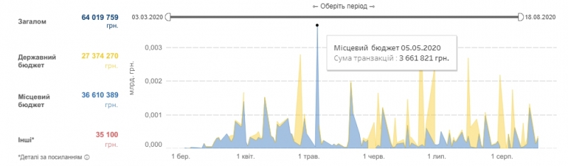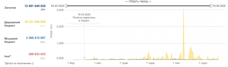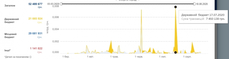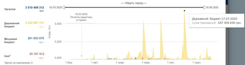 Найбільше перерахувань зроблено 17 липня — 547,3 млн грн — переважно лікарням за оплату медичних послуг, пов’язаних з COVID-19. Серед інших видатків — кошти на надбавки для працівників медичних закладів системи МВС (близько 14 млн грн).