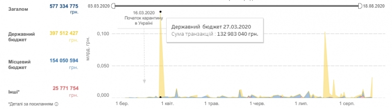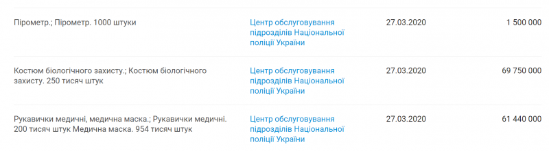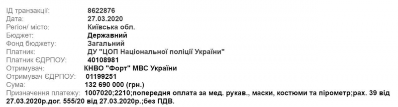 Найбільше перерахувань зроблено 27 березня — майже 133 млн грн на закупівлю обладнання та медичних засобів індивідуального захисту. Водночас найбільший перерахунок (132,7 млн грн) зроблено від ДУ «ЦОП Національної поліції України» до КНВО «Форт» МВС України» — закупівля захисних костюмів, медичних масок, рукавичок та пірометрів.