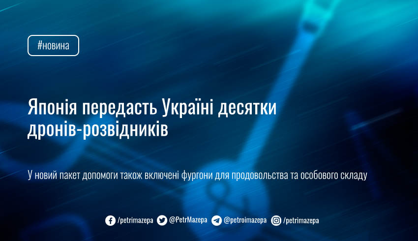 Міністерство оборони Японії анонсувало новий пакет допомоги для України – в нього включені декілька десятків розвідувальних безпілотників з камерами спостереження, а також фургони для перевезення особового складу та продовольства.