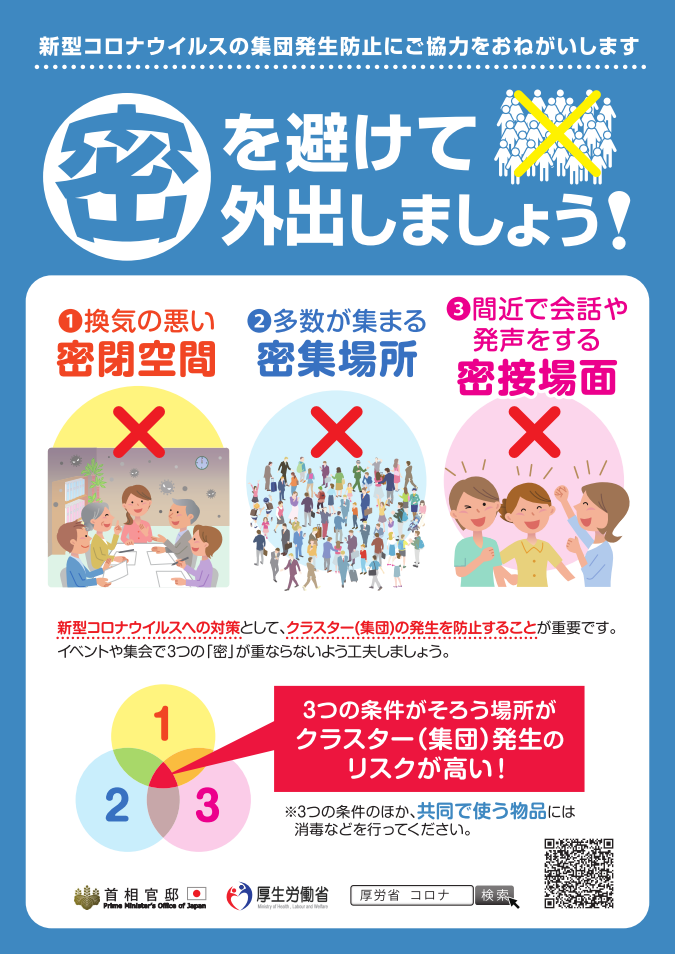 Відповідно Нарада наполегливо радить громадянам уникати місць, де ці три умови виконуються одночасно. Уряд Японії опублікував інфографіку, в якій закликає не відвідувати подібних місць.