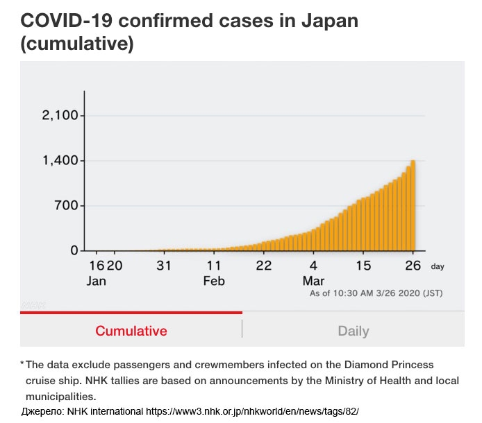 У Японії ж темп зростання зафіксованих випадків Covid-19 помірний через рекомендації Наради та можливі інші недоведені фактори: 40-70 нових випадків на день. Але така тенденція завжди існує «поки що».
