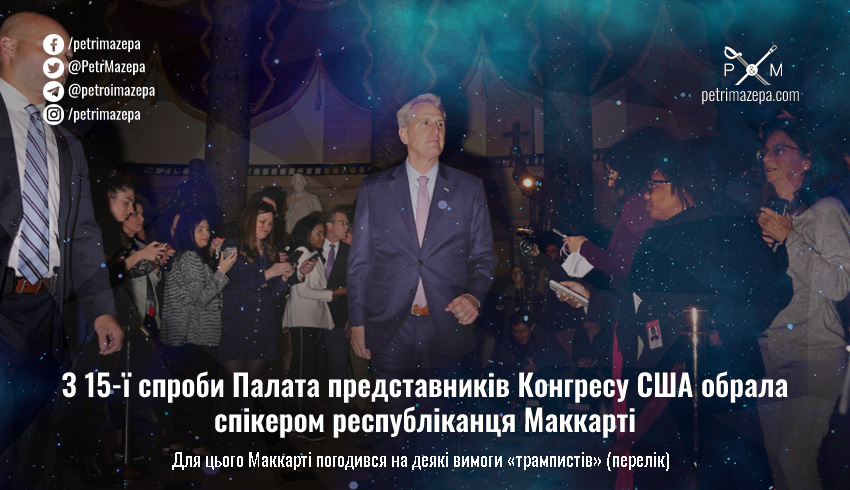 Уранці 7 січня Палата представників Конгресу США змогла скласти присягу. Головою Палати представників став лідер Республіканської партії США Кевін Маккарті. Але це йому вдалося лише з 15-ї спроби й звичайною більшістю.