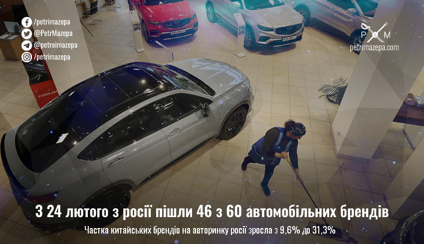 За неповний рік росію покинули 46 автомобільних брендів. Й тепер у росіян вибір лише між трьома російськими та 11 китайськими брендами. Про це йдеться у листі асоціації «Російські автомобільні дилери».