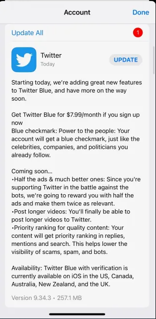 «Згідно з повідомленням iOS у додатку, оновлений Twitter Blue, починаючи з 7,99 долара на місяць, додасть синю галочку перевірки, раніше зарезервовану для облікових записів, які подали заявку через процес безплатної перевірки Twitter. Інші переваги, перераховані як "незабаром", включають "половину реклами", яку бачать користувачі Twitter, що не платять, а також нібито "вдвічі більш релевантну" рекламу (раніше Blue повністю видалив рекламу) і можливість публікувати довші відео у Twitter», — пише TechCrunch.