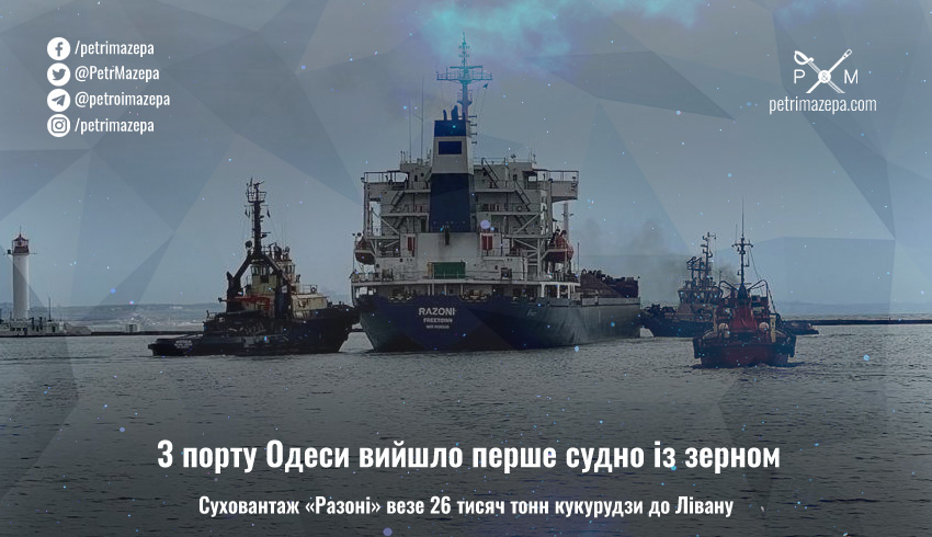 «Сьогодні о 09:15 вперше з 24 лютого очікуємо на вихід судна з Одеського порту, завантаженого українським продовольством. Йдеться про судно RAZONI, яке під прапором Сьєрра-Леоне прямує до порту Триполі в Лівані. Воно рухатиметься коридором, безпека якого підтверджена нашими партнерами-гарантами — ООН та Туреччиною. На його борту 26 тис. тонн української кукурудзи», — написав міністр інфраструктури Олександр Кубраков. Пізніше він підтвердив, що судно вже вийшло із порту.