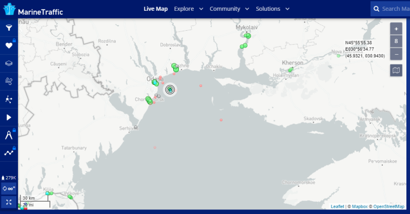 Міністерство інфраструктури України повідомило, що перше судно із зерном вийшло з порту Одеси. Судячи з даних MarineTraffic, суховантажне судно вже в Чорному морі. Судно RAZONI під прапором Сьєрра-Леоне прямує до порту Триполі в Лівані.