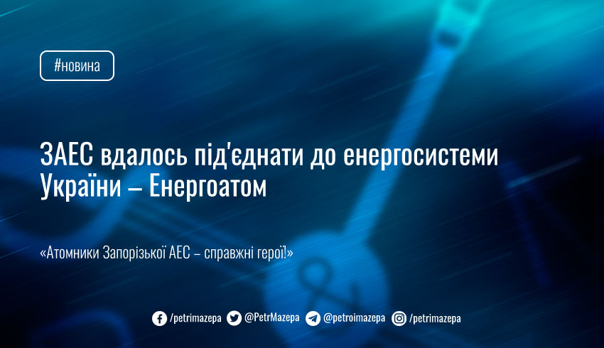 Запорізьку атомну електростанцію вдалось під'єднати до енергосистеми України — вона виробляє енергію для нашої країни, триває набір потужності.