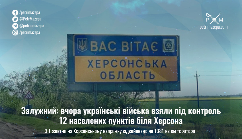 Головнокомандувач ЗСУ Валерій Залужний розповів, що лише за вчора підрозділи Сил оборони просунулись на 7 км углиб оборони противника на Херсонському напрямку та взяли під контроль 12 населених пунктів. А з 1 жовтня на Херсонському напрямку відвойовано до 1381 кв. км території.