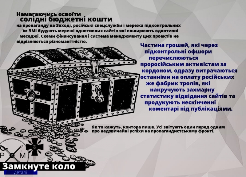 Знайомство з внутрішньою кухнею діяльності пропаганди РФ у країнах Заходу засвідчує, що нескінченні потоки дезінформації дуже часто є зробленими нашвидкуруч. Як це часто буває у мешканців «земель за поребриком», мережі інформаційного впливу будуються за принципом потьомкінських сіл. Намагаючись освоїти солідні бюджетні кошти на пропаганду на Заході, російські спецслужби й мережа підконтрольних їм ЗМІ будують мережі однотипних сайтів, які поширюють однотипні меседжі. Схеми фінансування і система менеджменту цих проектів не відрізняються різноманітністю. Частина грошей, які через підконтрольні офшори переказують проросійським активістам за кордоном, одразу витрачаються останніми на оплату російських же фабрик тролів, які накручують захмарну статистику відвідання сайтів і продукують нескінченні коментарі під публікаціями. Як то кажуть, контора пише. Усі звітують один перед одним про надзвичайні успіхи на пропагандистському фронті.