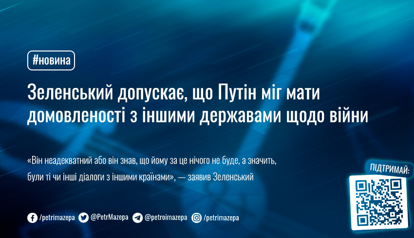 Президент Володимир Зеленський допускає, що Володимир Путін почав повномасштабну війну проти України після домовленостей з іншими країнами.