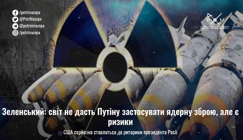 Президент Володимир Зеленський не вірить, що міжнародна спільнота дозволить володимиру путіну застосувати ядерну зброю, але не виключив ризиків, оскільки «не можливо зазирнути в голову» путіну.