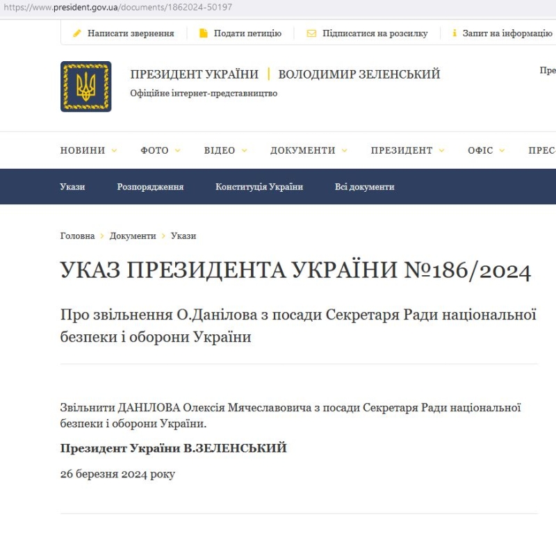Президент Володимир Зеленський сьогодні, 26 березня, звільнив Олексія Данілова з посади секретаря Ради національної безпеки і оборони.