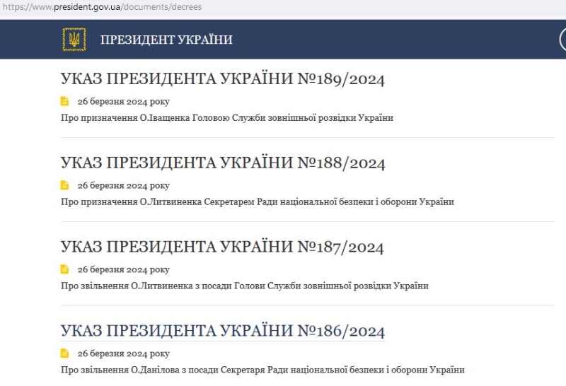 Також Зеленський звільнив Олександра Литвиненка з посади голови Служби зовнішньої розвідки і призначив його на місце Данілова.
