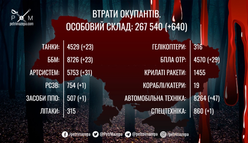 Протягом минулої доби наша авіація завдала десяти ударів по районах зосередження особового складу, озброєння та військової техніки та по позиціях ЗРК, а Ракетні війська та артилерія уразили склад боєприпасів, шість артилерійських засобів, два пункти управління та два ЗРК.