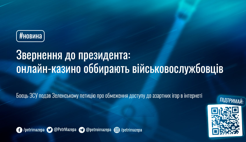 29 березня військовослужбовець 59 бригади Павло Петриченко зареєстрував петицію, де звернув увагу на шкоду, якої гральний бізнес завдає українській армії й українському суспільству.