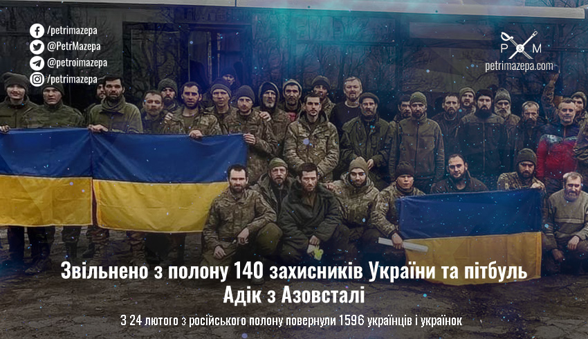 31 грудня відбувся черговий обмін полоненими. З російського полону були звільнені 140 захисників і захисниць України. Серед звільнених — поранені, захисники Маріуполя, острова Зміїний, добровольці ТРО зі Славутича, а також наші з Бахмутського напрямку. Також додому повернувся пітбуль Адік з Азовсталі.