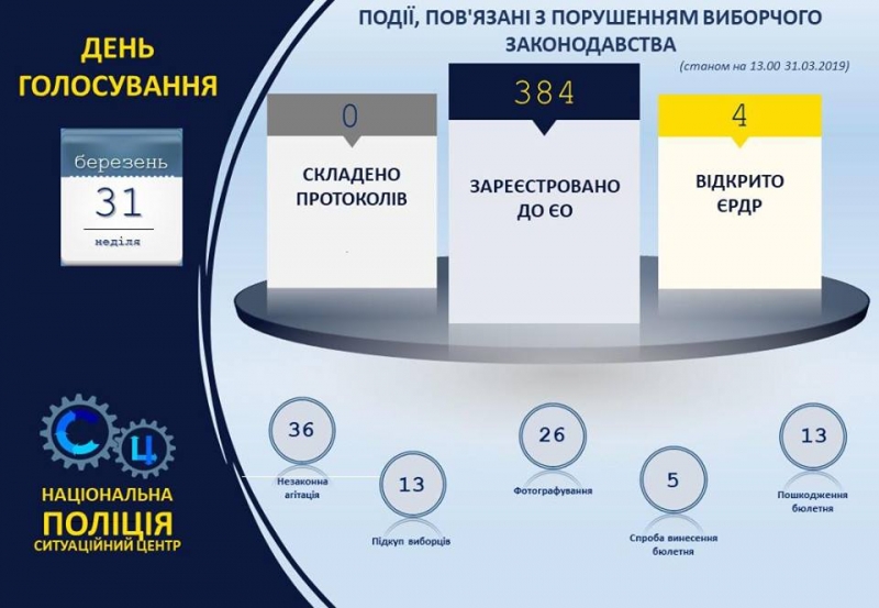 31 марта в органы полиции поступило 151 заявление и сообщения, связанные с избирательным процессом. Больше всего обращений – из Донецкой области (21) и г. Киева (19), также в лидерах Днепропетровская, Одесская и Харьковская области. В основном эти факты связаны с незаконной агитацией, фотографированием бюллетеней, их повреждением или попытками вынести из УИК, отмечены 6 фактов подкупа избирателей и 1 кража кабеля. По одному из фактов открыто уголовное дело по ч. 2 ст. 158-2 о фальсификации избирательных документов.