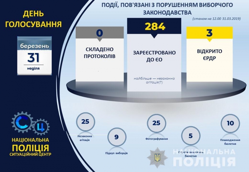 По состоянию на 12:00 в полицию поступило 284 сообщения о нарушении избирательного законодательства на выборах, открыто три уголовных дела, в том числе и по факту поджога в Черновцах, подозреваемый был задержан. Большая часть сообщений касалась незаконной агитации, фотографирования бюллетеней и подкупа избирателей.