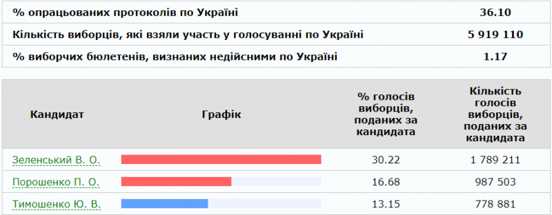 По результатам обработки 36,1% бюллетеней на первом месте остается Владимир Зеленский, с его 30,22% голосов. Разрыв между Петром Порошенко и Юлией Тимошенко сохраняется на уровне 3,5%.
