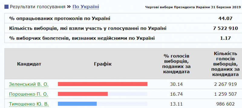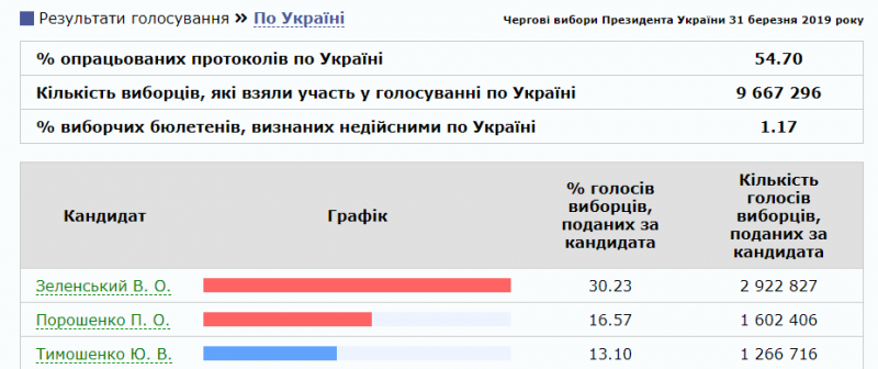 По результатам подсчета 54,7% голосов лидер предвыборной гонки Владимир Зеленский набрал 30,23% голосов. Действующий президент Петр Порошенко на втором месте с 16,57% голосов. На третьем месте – Юлия Тимошенко с 13,1%.