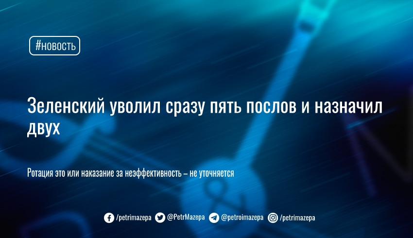 Президент Владимир Зеленский в пятницу уволил сразу пять украинских послов — в Ливане, Португалии, Словакии, Грузии и Иране. Назначены были два посла — в Новой Зеландии и Таджикистане.