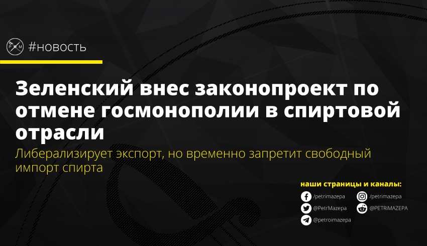Кроме того, законопроект вводит полную либерализацию экспорта спирта из Украины. В то же время, Зеленский предлагает временно запретить свободный импорт спирта в Украину. В частности, к 2022 году законопроектом предусмотрен запрет на импорт спирта, который будет распространяться на все компании, кроме ряда государственных, которых определит Кабмин.